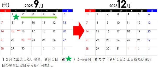 出店を希望する日の3か月前の日の属する月の初日(土日祝及び閉庁日の場合はその翌日)から申請を受け付けます。