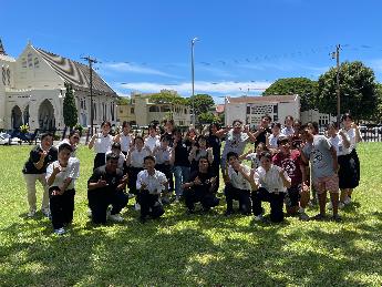 締結式には、ケエリコーラニ・ミドルスクールの校長先生はじめ、生徒の皆さんも参加されました。当日は姉妹校提携を記念して制作されたTシャツを白浜町の参加者にもご用意いただき、全員がおそろいのTシャツを着て式に臨みました。